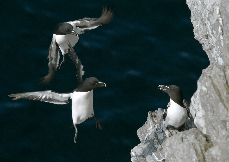 Seabirds are similarly vulnerable. Many species rely on visual cues to locate prey at or below the sea surface, and increased turbidity and wave action impair prey detection. For surface-feeding and plunge-diving species, such as terns, gannets, and kittiwakes, rough seas can prevent successful prey capture altogether. Additionally, severe storms can cause direct mortality through exhaustion, collision with rocks or infrastructure, or drowning. Birds may be blown far offshore or forced inland.